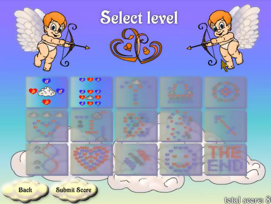 Войдите в роль Купидона, создавайте пары сердец, поражая их стрелами любви. Вам, как Купидону, поставлено задание - собрать достаточное количество пар сердец. Кликайте мышью чтобы пустить стрелу. Скорость стрелы зависит от расстояния между купидоном и курсором. Стрелы застревают в облаках и отскакивают от туч. Золотые стрелы проникают сквозь сердца. Пользуйтесь мышью для того чтобы целится и пускать стрелы, нажимайте кнопки 1-2-3 чтобы менять тип стрел.